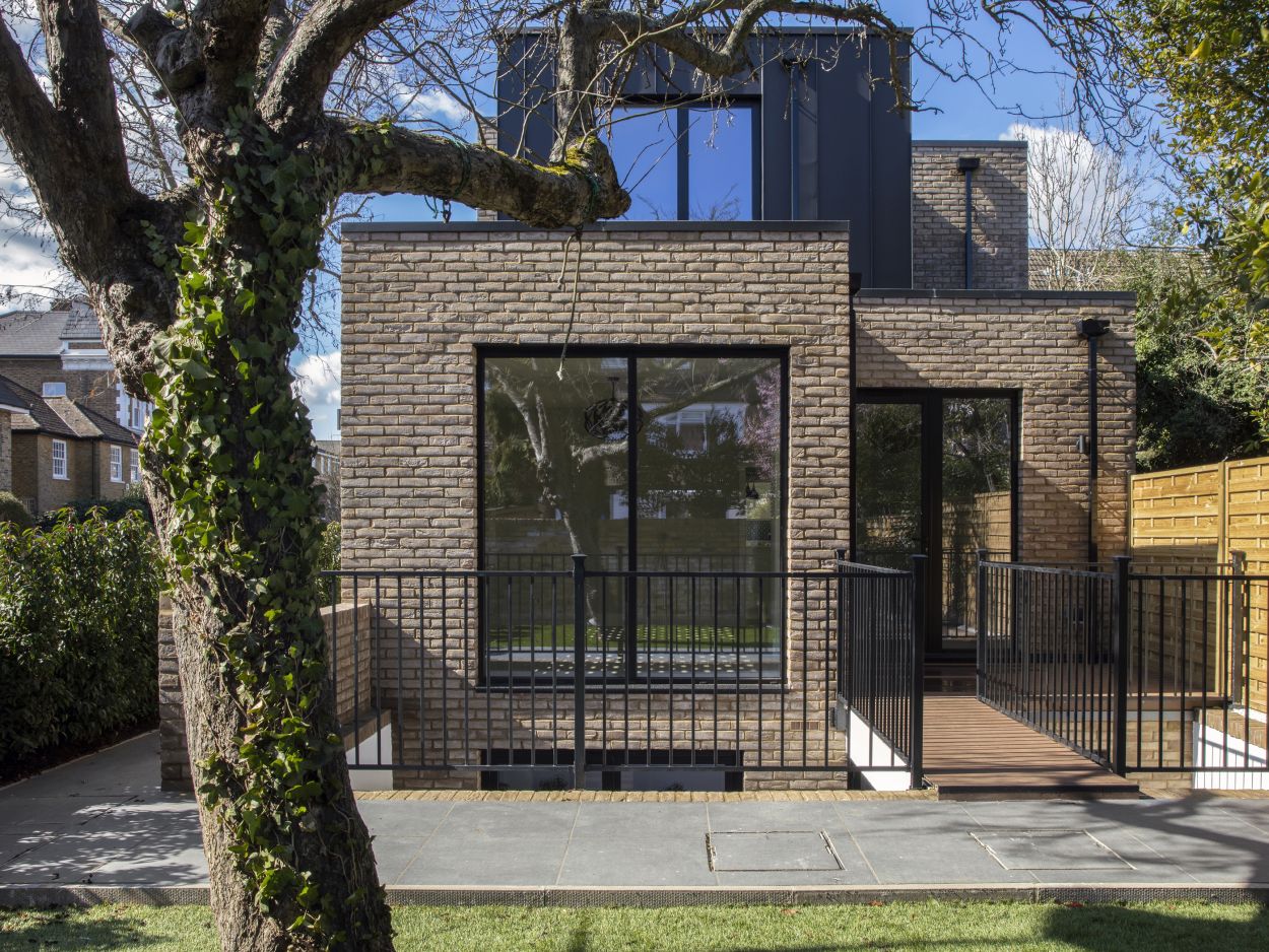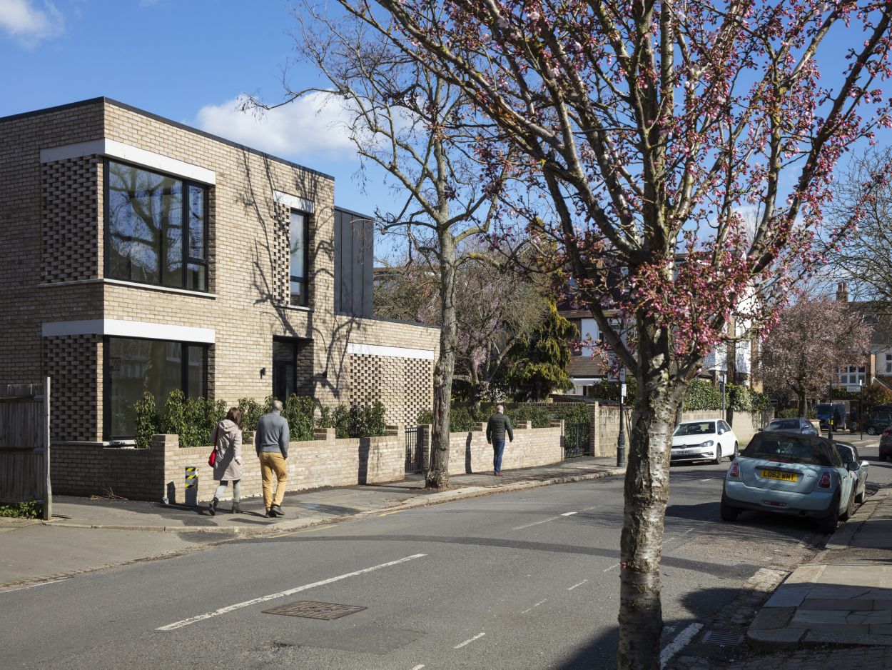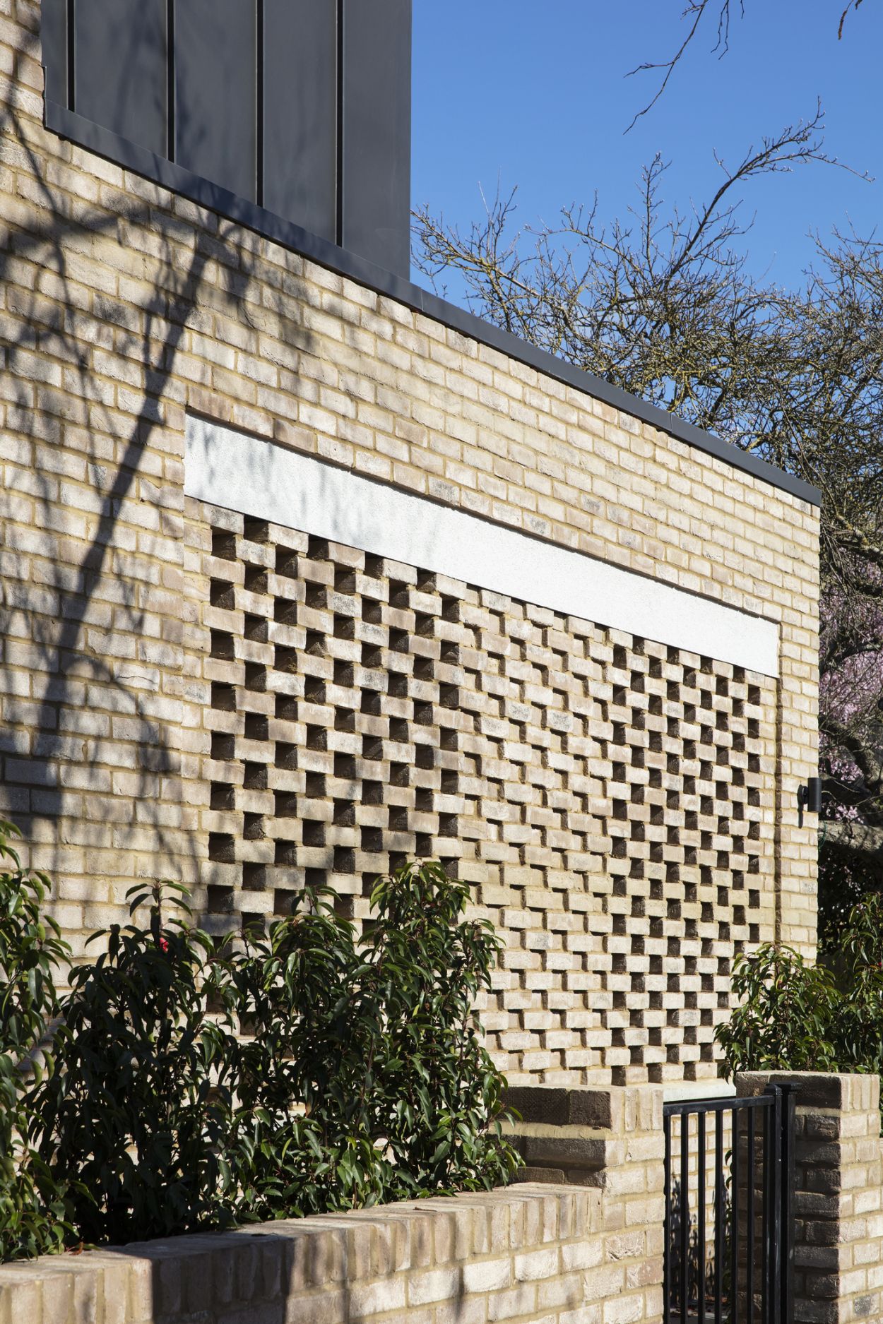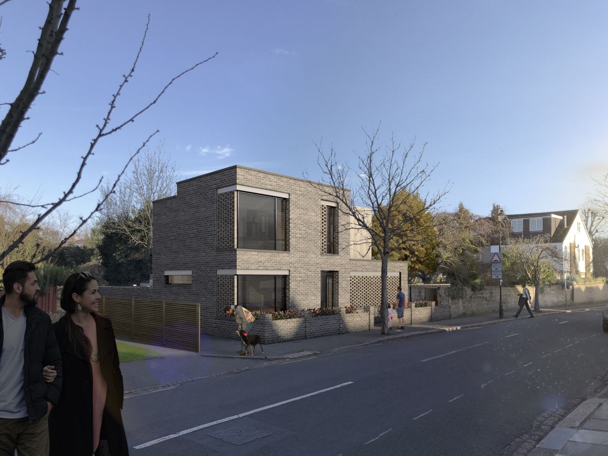 The proposed family house over basement, ground and first floors incorporates a mixture of private terrace areas, generous courtyard spaces linked by a staircase at basement level and bridge at ground level. Deep set windows wrap around the corner of the facades to acknowledge the context relationship. The windows are further set behind a layer of hit and miss brickwork with recessed stone lintels to articulate the openings.