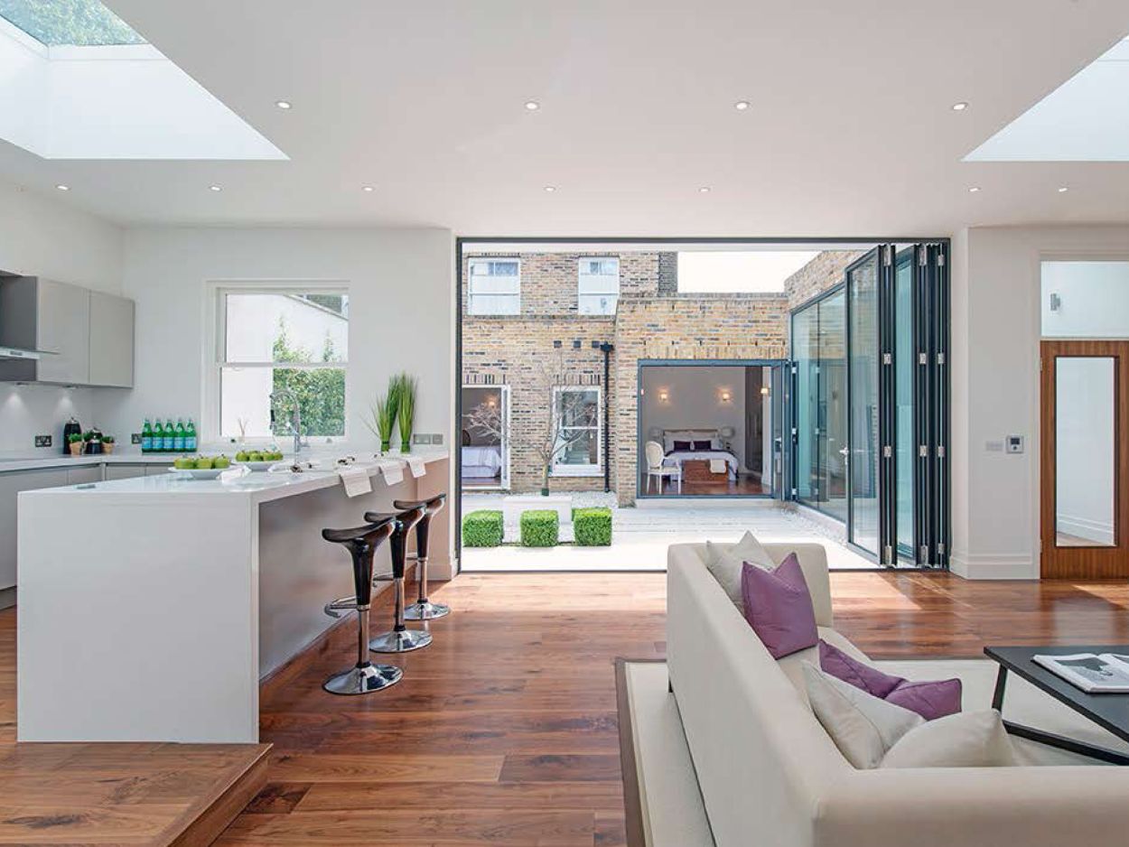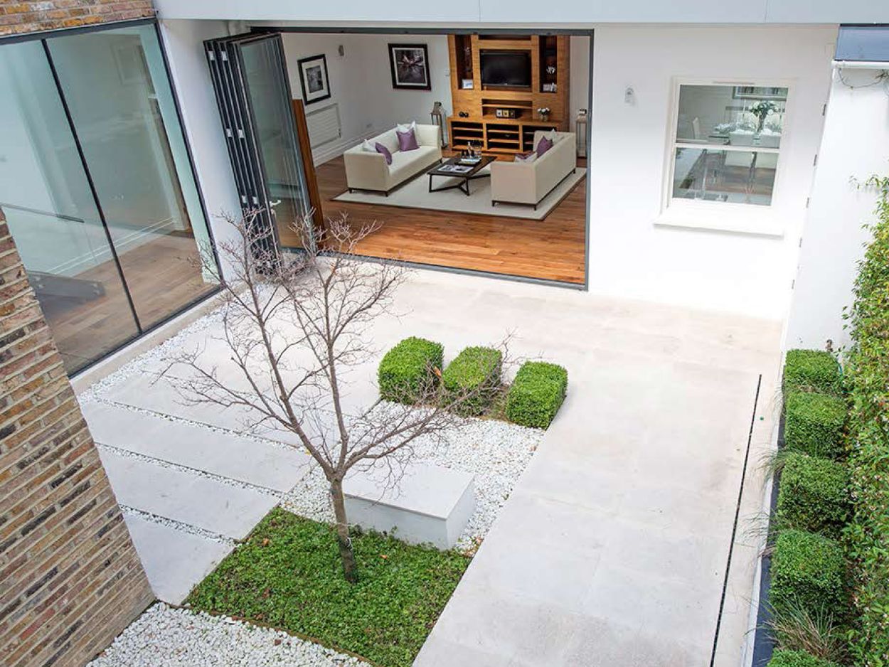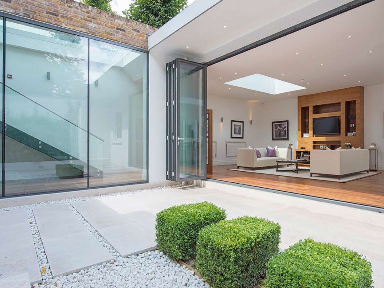 A 2000 sq ft apartment was created by demolishing the garages behind a large Victorian mansion and partly excavating the garden. The accommodation comprises of two bedrooms and generous reception space arranged around a landscaped courtyard garden.