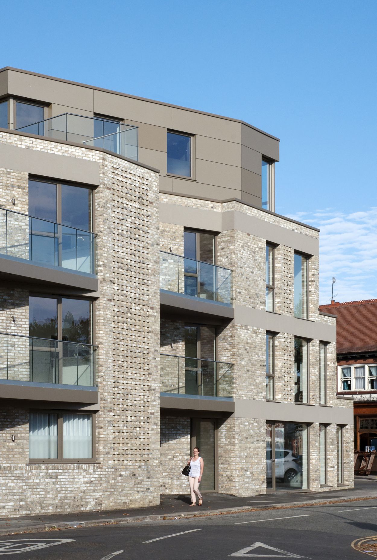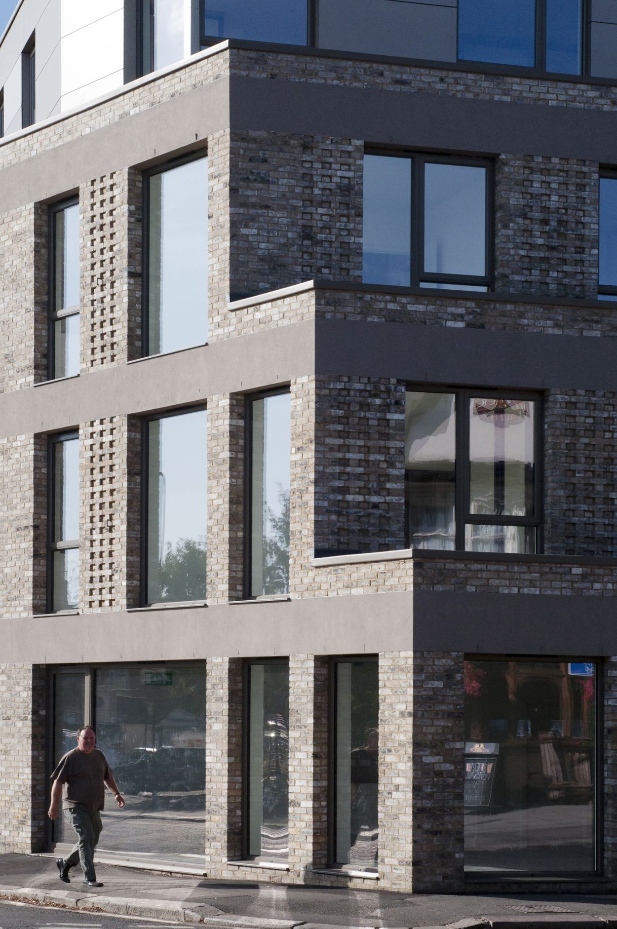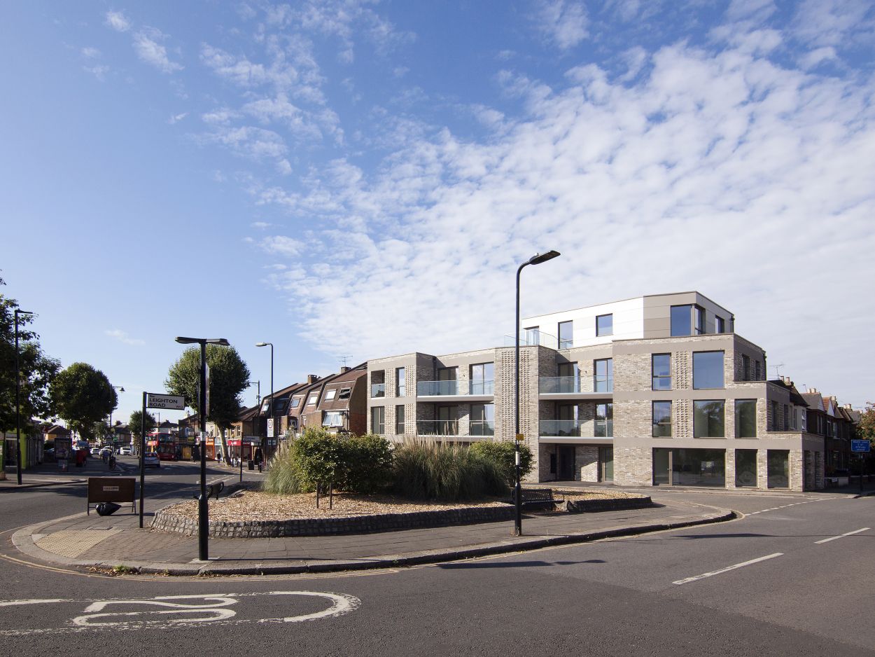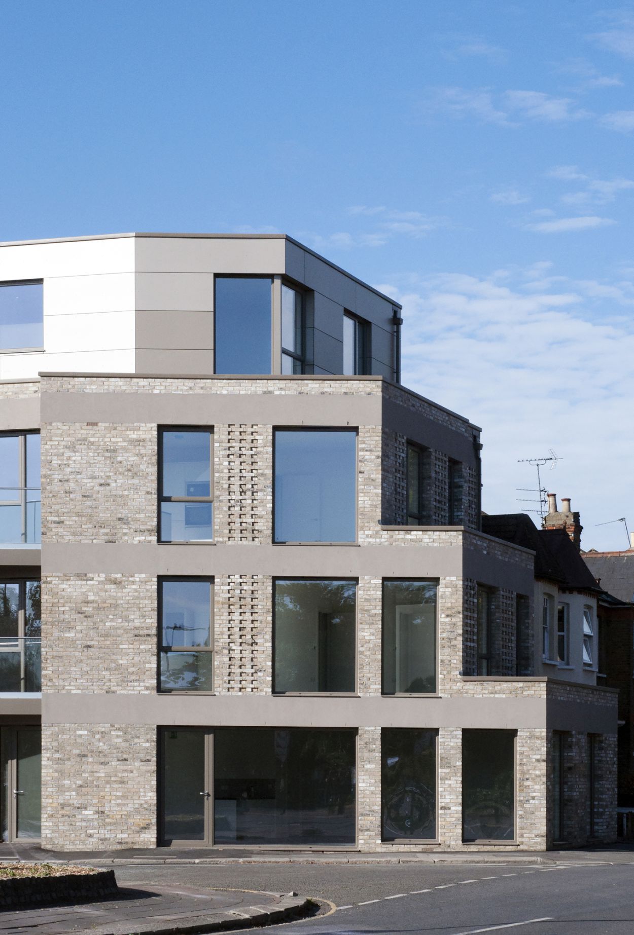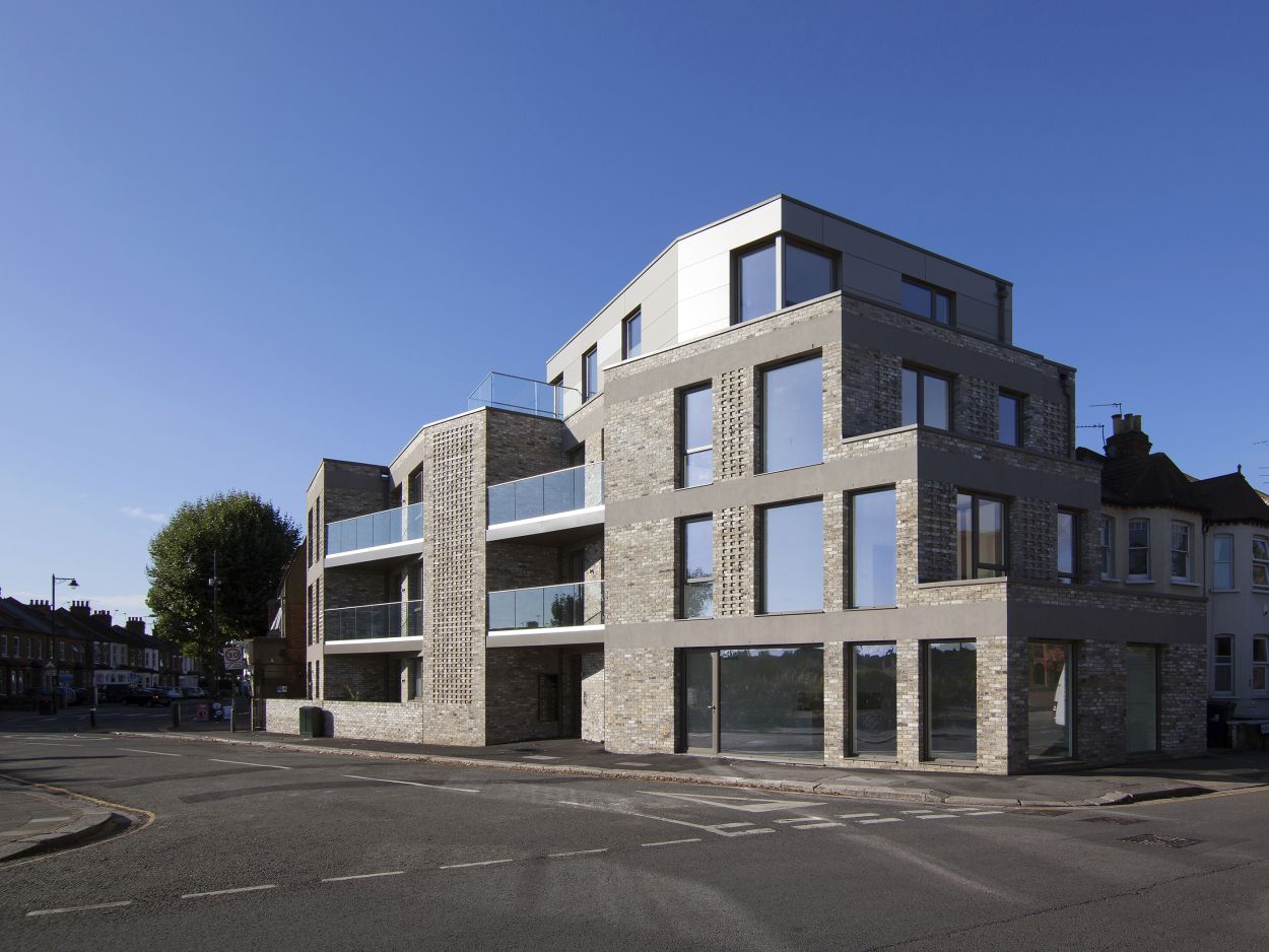 A residential led redevelopment of a prominent corner location leading to Northfield Avenue shopping parade. The building consists of a commercial unit, six apartments and one family house all with private amenity spaces. The facade materials include brick and stone banding with anodized cladding to the top storey.