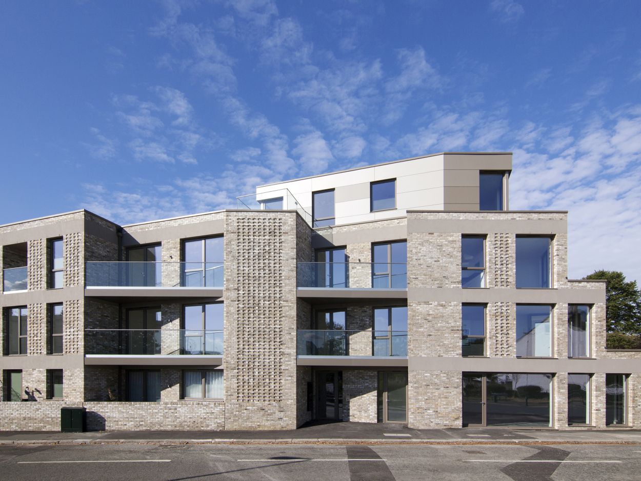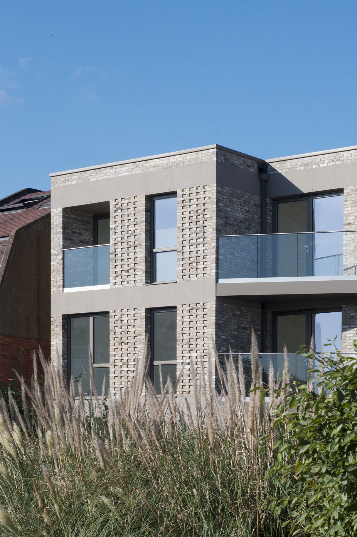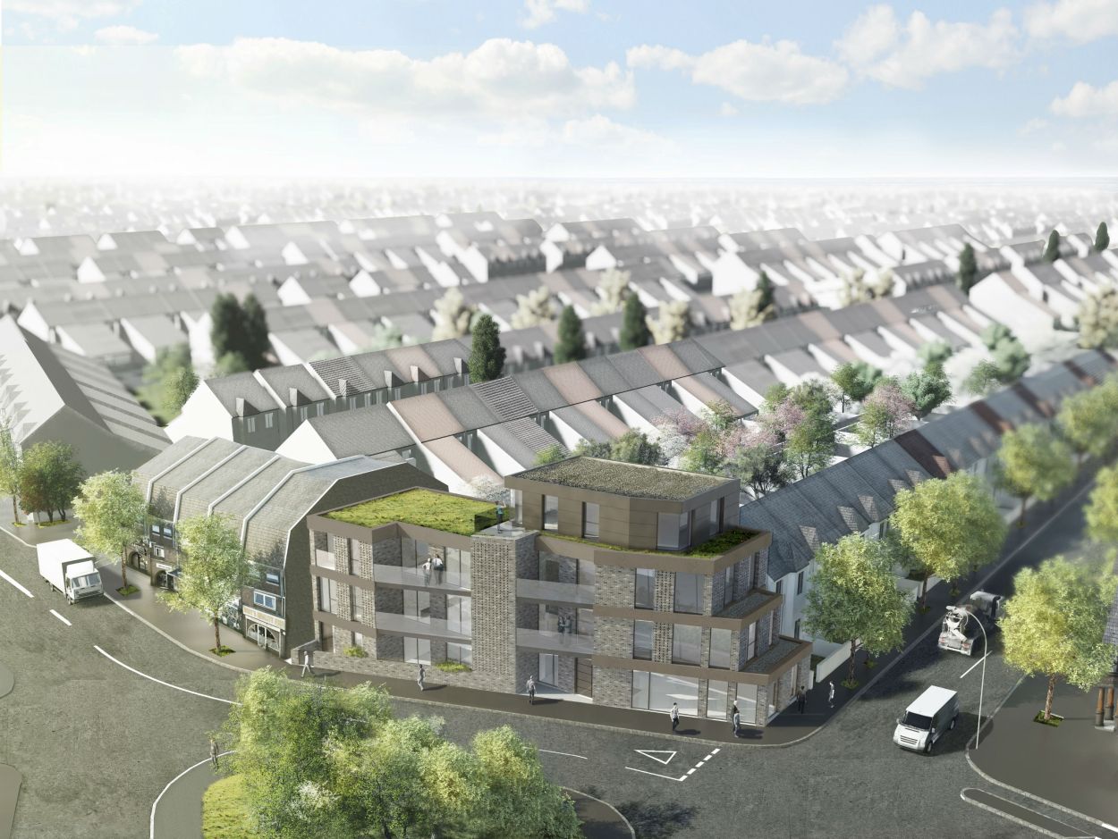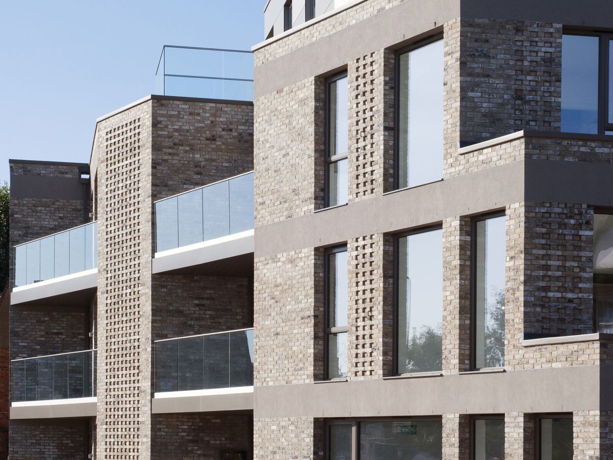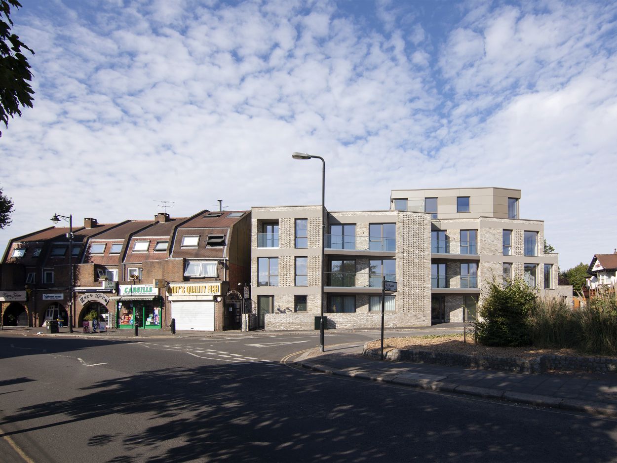A residential led redevelopment of a prominent corner location leading to Northfield Avenue shopping parade. The building consists of a commercial unit, six apartments and one family house all with private amenity spaces. The facade materials include brick and stone banding with anodized cladding to the top storey.